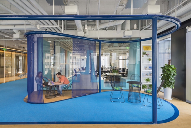 本案是旅游公司的辦公室裝修設計,室內空間更偏向于年輕而新興,整個空間都是海藍色,為了讓這種視覺淋漓盡致的呈現,深藍色的高架管道沿著大廳周圍循環,劃分了大廳區域內不同的小區域,地毯的顏色和海浪般的邊緣看起來像海面,透明的玻璃材質則像是陽光,可以反射進深處的空間,所以在光線上起到了輔助效果。