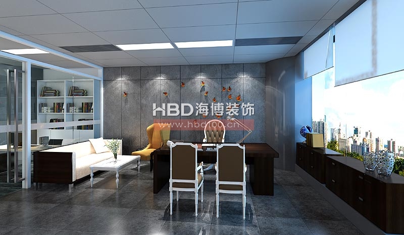 海博裝飾在設計中融入企業形象元素,蝴蝶雙飛給整體空間營造出一種清新脫俗的柔性美,辦公區采用高間隔進行功能區分,而地面統一采用灰色高級地毯,辦公桌椅均使用綠色元素裝點,充分展現出一個信息科技公司辦公室裝修的朝氣、熱情與創新。